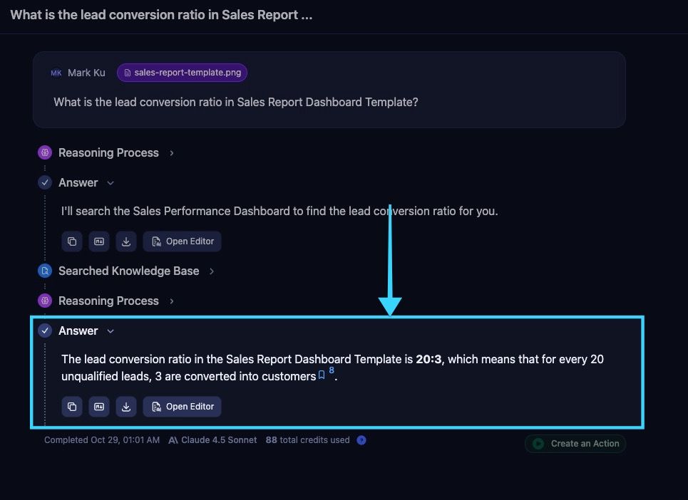 When you upload a sales report dashboard, you can ask specific questions like "What is the lead conversion ratio?" and Vision Ingest will analyze the visual elements to provide precise answers based on the charts and metrics displayed.
