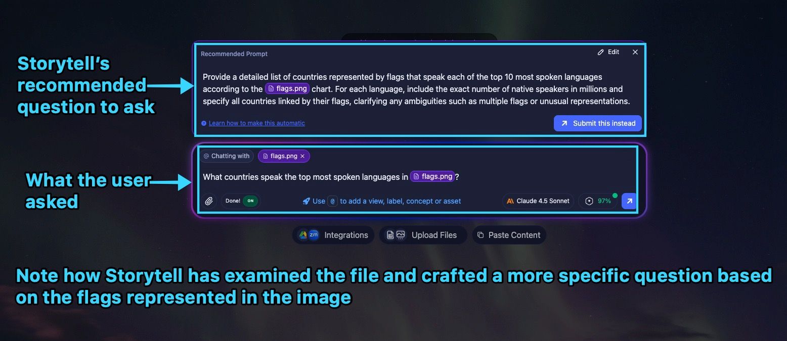 Vision Ingest analyzes uploaded visual content and can suggest more precise prompts to help you get better answers about your visual data.