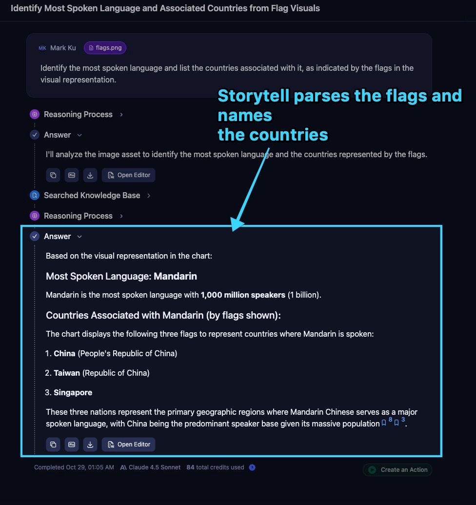 Storytell Vision Ingest interprets charts, graphs, images, and flags, transforming visual content into structured, query-ready insights for a comprehensive understanding of your documents.